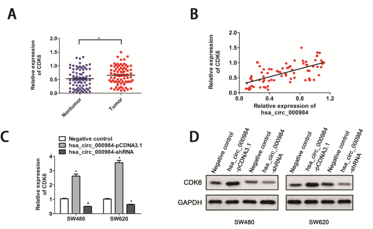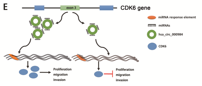 细胞周期素激酶家族核心成员CDK6可促进细胞从G1期到S期,过往研究表明CDK6在多种肿瘤的发生发展过程起作用,据此本文作者选定CDK6基因来源的环形RNA分子hsa_circ_000984作为研究对象, 考察了hsa_circ_000984在结肠癌CRC临床组织标本和细胞中的表达水平,并验证出hsa_circ_000984通过吸附miR-106增强结肠癌的增殖和侵袭能力。