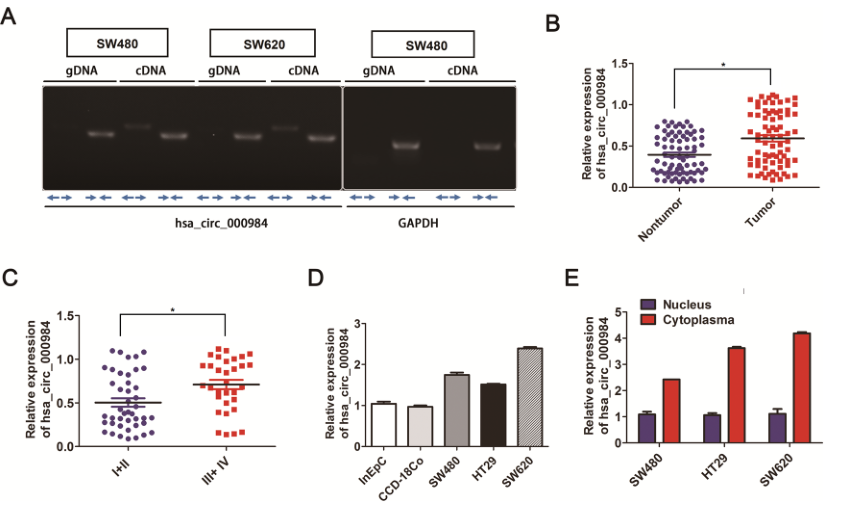 图1注:hsa_circ_000984在结肠癌组织标本和细胞中高表达,并主要集中在细胞质中