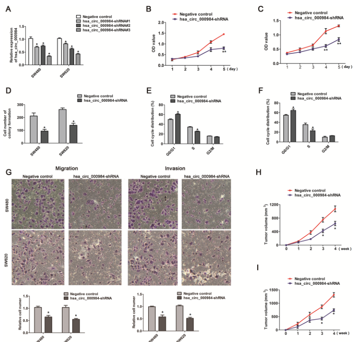 图2注:ShRNA敲低hsa_circ_000984后可抑制结肠癌细胞的增殖和侵袭能力