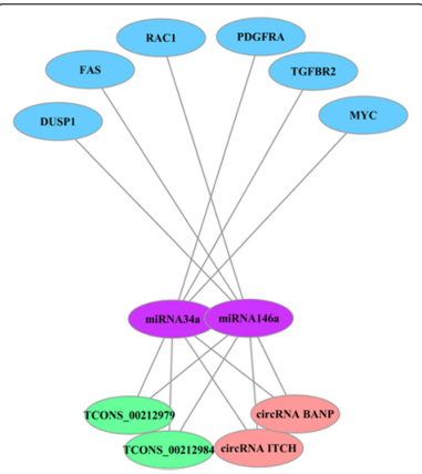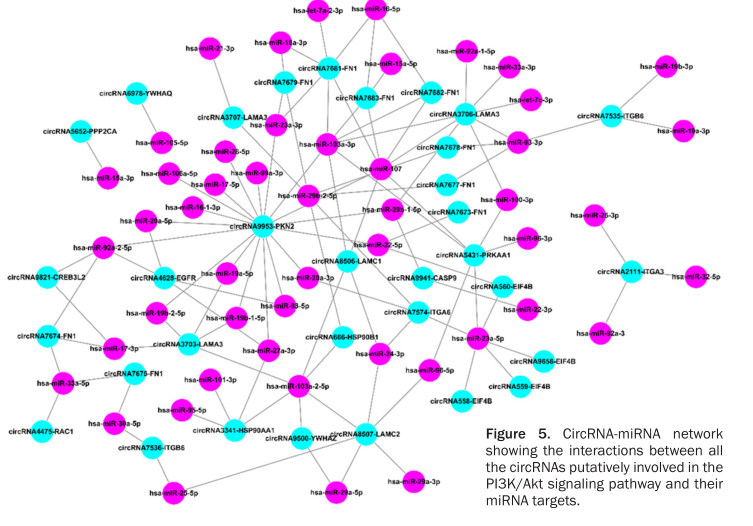 图3注:PI3K/AKT信号通路中circRNA和miRNA互作子网络