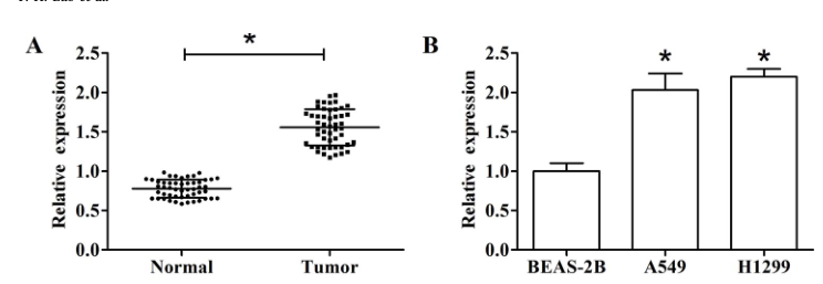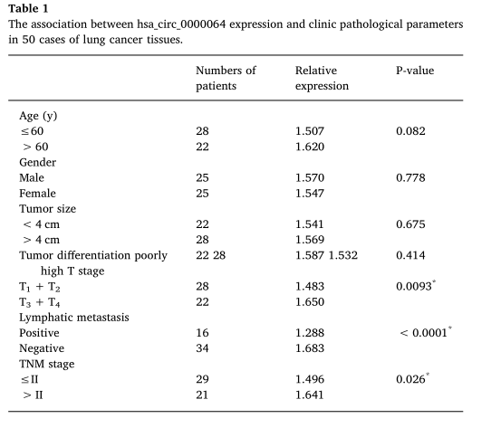 该研究考察了hsa_circ_0000064在50对肺癌患者组织标本中的表达情况,Qpcr实验表明hsa_circ_0000064在肺癌组织中显著高表达,临床相关性分析表明该circRNA与肺癌转移以及肿瘤分级显著相关,表明hsa_circ_0000064在肺癌发生发展可能起着重要作用,进一步的功能实验表明敲低hsa_circ_0000064可抑制肺癌细胞的增殖和侵袭能力,促进癌细胞凋亡,hsa_circ_0000064可能通过调控MMP-2,MMP-9金属蛋白酶发挥促癌作用。