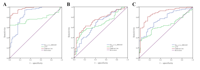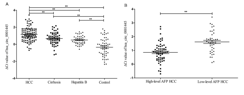研究者在73对肝癌患者组织标本中qpcr检测hsa_circ_0001445的表达水平,结果显示hsa_circ_0001445在HCC肝癌组织中显著低表达,体外细胞实验表明过表达hsa_circ_0001445可显著抑制肝癌细胞增殖、迁移和侵袭。临床资料分析表明hsa_circ_0001445在肝癌患者的表达水平显著低于肝硬化、乙型肝炎病人和正常人,可作为潜在分子标记物。