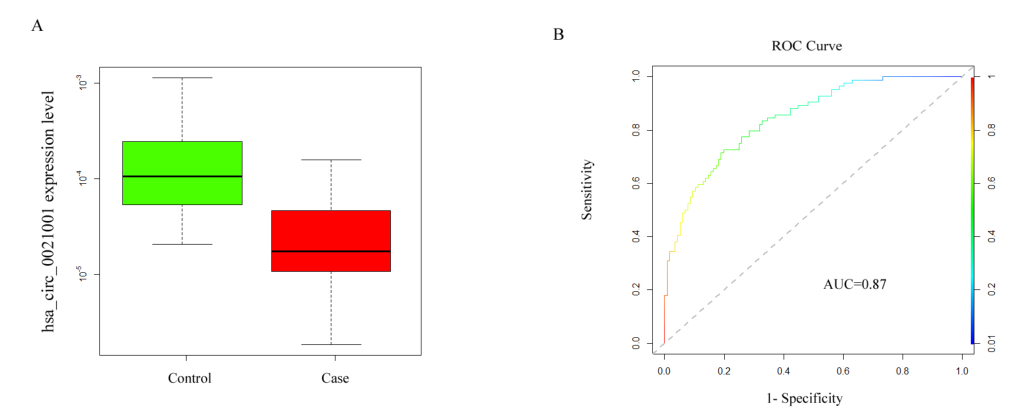 图注:hsa_circ_0021001在AI患者外周血中表达显著低于健康对照组,ROC曲线AUC=0.87