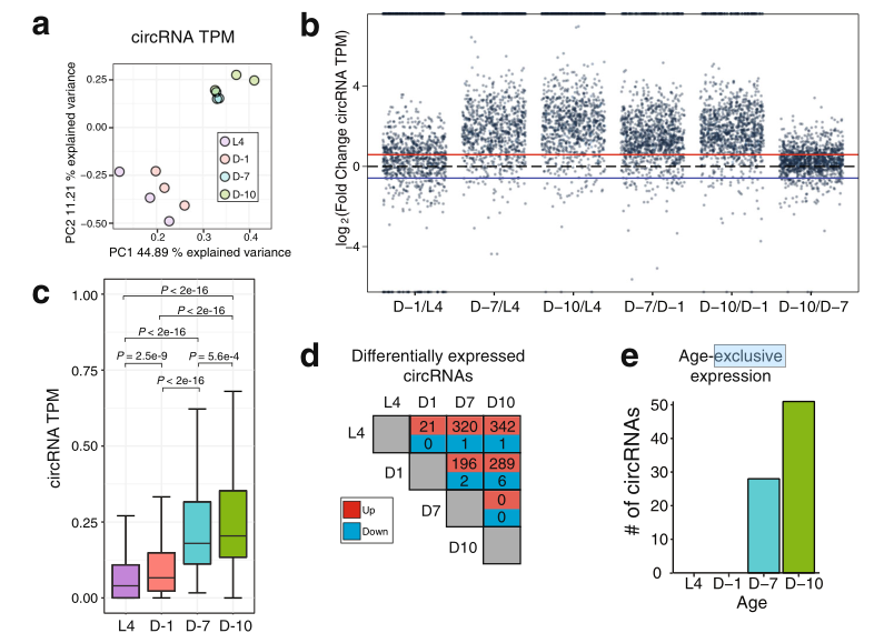 图注:线虫衰老过程中伴随多数circRNA的富集