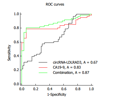 图注:circ-LDLRAD3与CA19-9联合诊断ROC曲线下面积达到0.87