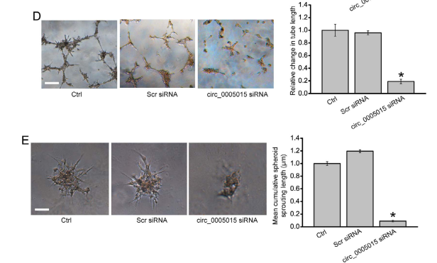 图注:敲低Circ_0005015分子可降低HRVECs细胞的脉管形成能立