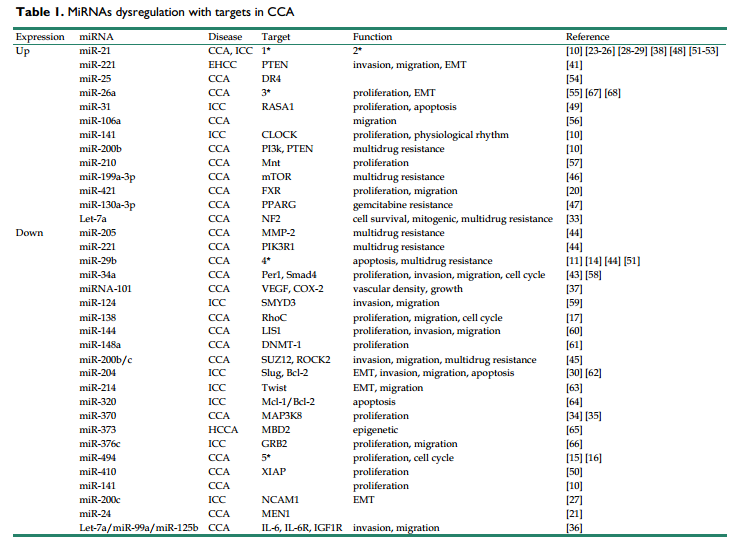 图注:胆管癌CCA中主要失调控的miRNAs分子列表