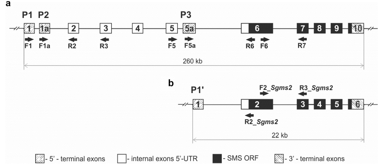 图注:sgms1和sgms2基因结构示意图已经PCR引物设计位置