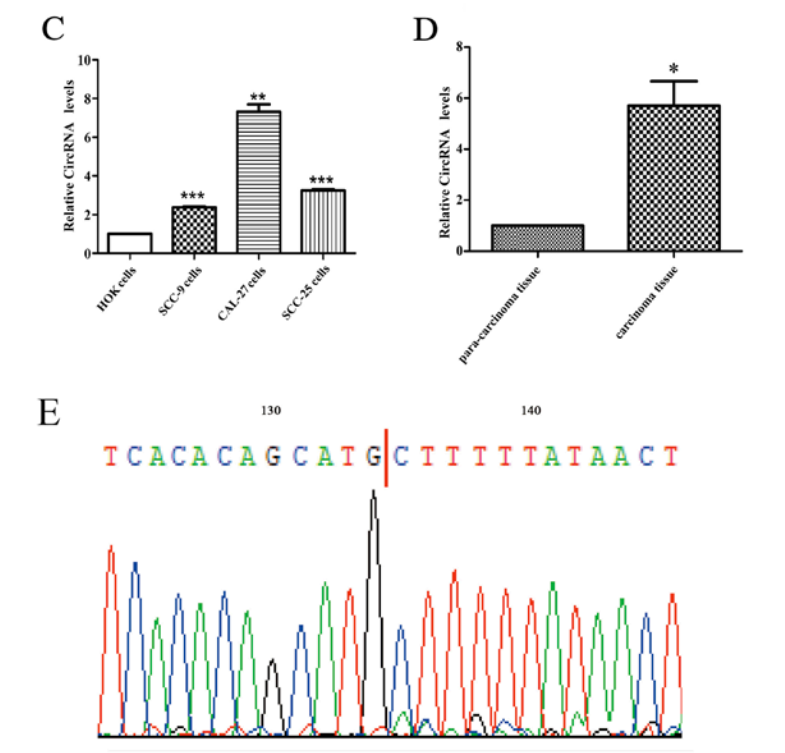 图注: circDOCK1 (circ_100721)在口腔癌细胞和临床组织标本中高表达