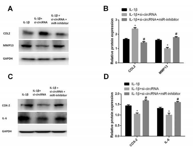 图注:circRNA_Atp9b和miR-138-5P影响MMP13, COX-2 和IL-6的表达水平