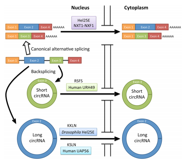 图1:circRNA(长/短序列)出核分子机制示意图(Hopper AK,et al.2018. Genes Dev)