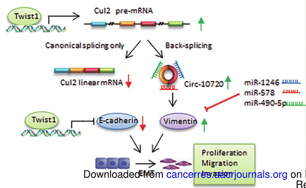 以往研究表明Twist是肿瘤转移EMT过程中的非常重要转录因子之一,它可以上调波形蛋白Vimentin蛋白的表达,进而促进肿瘤发生上皮间质转化(EMT),但其中具体机制尚不清楚。Twist转录因子可以结合Cul2基因的启动子区域选择性激活Cul2—circRNA(circ-
