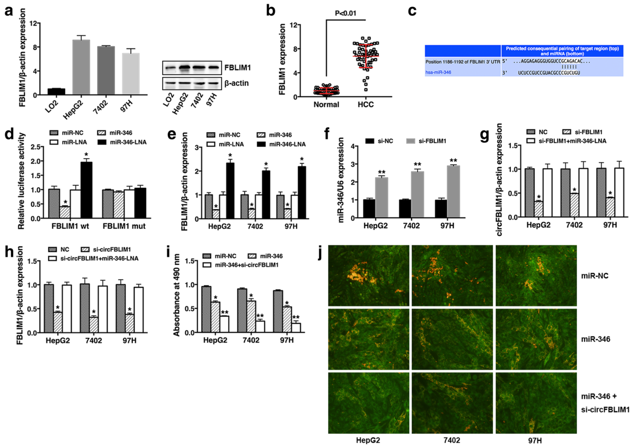 i: HCC细胞转染miR-NC, miR-346 或miR-346+si-circFBLIM1后,CCK8检测细胞增殖能力;