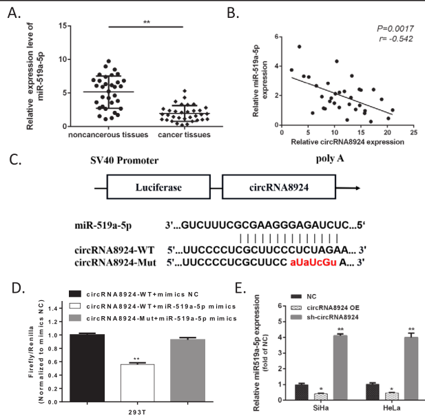 B:circRNA8924与miR-519a-5P在宫颈癌组织中的表达水平显著负相关;