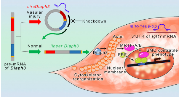 正常情况下,Diaph3会促进VSMCs中收缩标记物的合成。在动脉损伤后,circDiaph3增加,导致线性Diaph3的mRNA相对减少,进而Diaph3蛋白合成下降。因此,VSMCs表现特征是收缩标记的减少,胶原蛋白合成的升高,以及细胞增殖和迁移的增加。在血管损伤后,VSMCs中miR-148a-5p的表达减少,miR-148a-5p靶向的Igf1r的mRNA,Igf1r蛋白减少。此外,circDiaph3通过ceRNA机制与胞质中游离的miR-148a-5p结合,从而减少了miR-148a-5p的活性。miR-148a-5p的丰度和活性的减少,在VSMCs中引发了Igf1r转录的升高,从而通过IGF-1信号通路促进血管内膜增生。