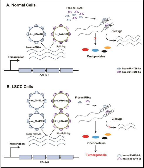 图注:hsa_circ_0044520和hsa_circ_0044529通过竞争性吸附hsa-miR-4726-5p和hsa-miR-4640-5p调控喉癌LSCC形成的可能分子机制