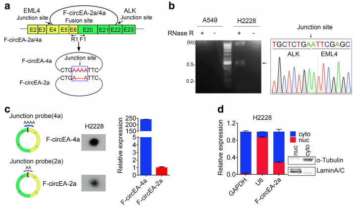 图注:F-circEA-2a在NSCLC中的鉴定,a:F-circEA-2a起源于EML4-ALK基因的事宜图;b:RT-PCR和sanger测序验证F-circEA-2a的拼接位点;c:斑点印迹和qPCR实验鉴定F-circEA-2a和4a在H2228细胞中的表达情况;d:qPCR实验分析F-circEA-2a/4a在H2228细胞质和细胞核中的表达比例。