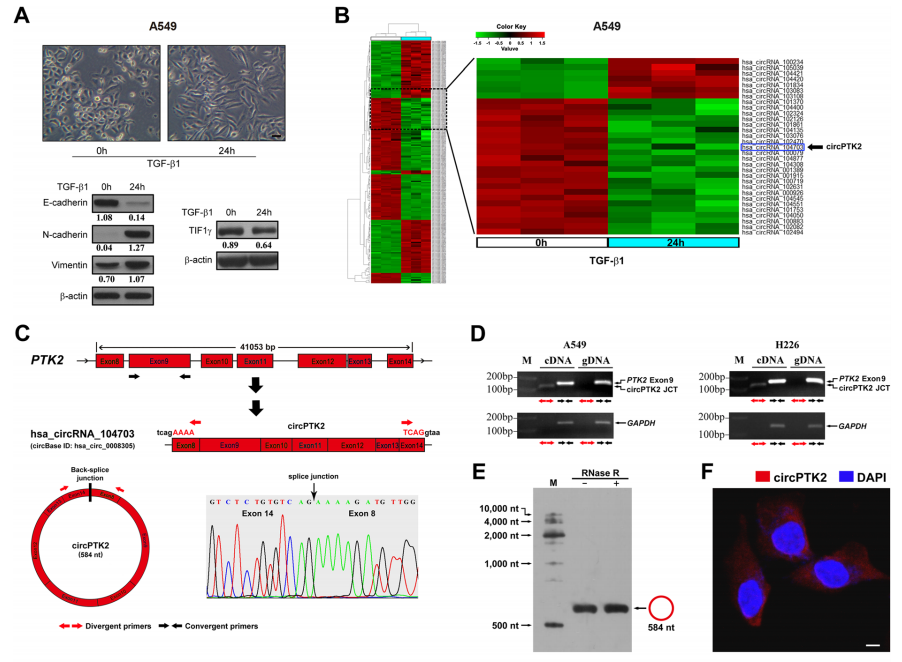图注:在TGF-β诱导的NSCLC细胞EMT过程中TIF1γ 和circPTK2表达下调。a:TGF-β1(5ng / ml)处理24小时后,A549细胞发生上皮-间质转化(EMT)。观察细胞形态并用相差显微镜(上图)拍照,比例尺,50μm。通过蛋白质印迹检查EMT相关蛋白的表达,包括E-钙粘蛋白E-cadherin,N-钙粘蛋白N-cadherin和波形蛋白Vimentin(左下)和TIF1γ蛋白(右下)。b:circRNA芯片检测TGF-β1处理0小时或24小时的两组A549细胞检测绘制circRNA表达层次聚类热图,circPTK2(hsa_circRNA_104703)的表达用箭头表示。cdef:RT-PCR,sanger测序,northblot和免疫荧光实验鉴定circPTK2(hsa_circRNA_104703)特异性存在,并主要分布在细胞质中。