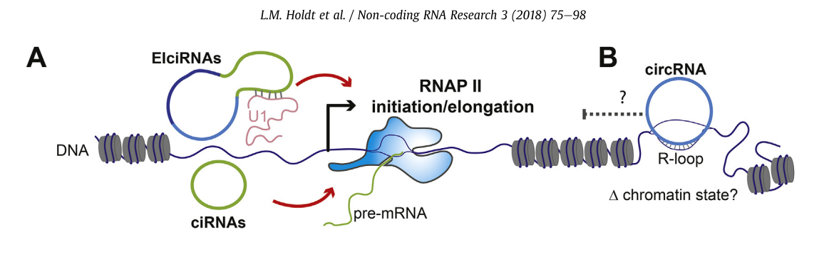 图A:ElciRNAs和ciRNAs可与宿主基因基因座结合促进RNAP II转录pre-mRNA;B:circRNA可结合宿主基因的DNA序列上形成R-loop结构影响染色体的稳定性,进而调控基因转录;