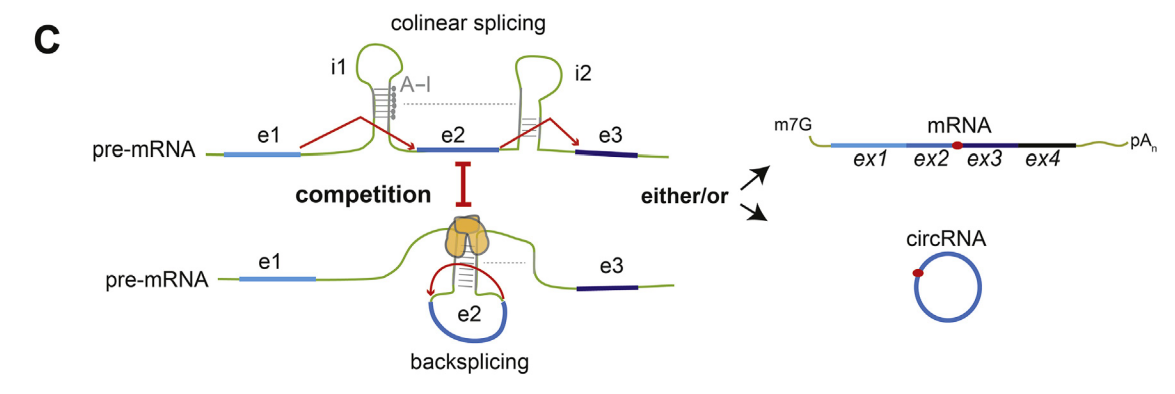 C图:共线剪接(上图)和共转录后反向剪接(下图)之间竞争的模型:竞争这是由于不同的内含反向重复配对序列(灰色部分)之间配对形成的折叠结构。在双链RNA内通过ADAR酶选择性地将腺苷脱氨作为肌苷回折区域中的斑块可以促进线性mRNA形成(顶部)。像Quaking或Muscleblind(橙色)这样的RNA结合蛋白结合并同源二聚化,从而可以促进通过支持内含子的反折叠来形成环状RNA(底部),两种机制间的竞争直接影响到circRNA和mRNA在细胞内的含量。