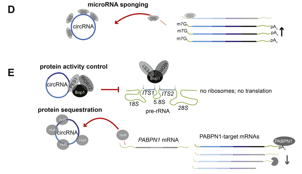 D图:circRNA经典的miRNA sponging模型,circRNA上螯合结合miRNA的AGO2复合体,减少细胞中miRNA的活性,间接增加对应mRNA的丰度,影响细胞功能;E图:circRNA直接与功能蛋白结合调控细胞功能,circANRIL结合PeBoW复合物的PES1蛋白,进而阻断核糖体rRNA成熟,抑制翻译功能。circPABPN对HuR蛋白的螯合,降低了PABPN mRNA稳定性,最终PABPN1蛋白含量降低。