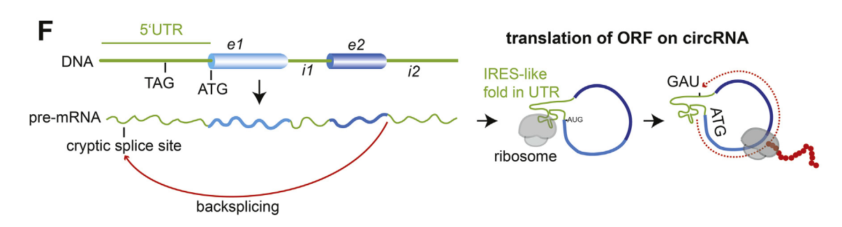 图F:circRNA直接翻译蛋白,circRNA序列中包含开放阅读框(ORF)和核糖体进入位点(IRES)理论上就能翻译成蛋白。