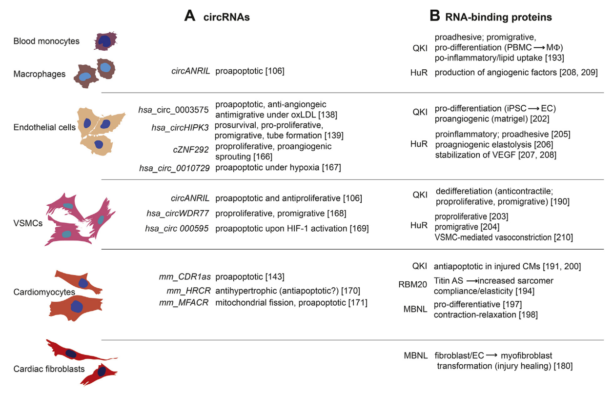 图:目前已报道的心血管疾病相关主要circRNA分子总结,左侧描绘了已知心血管疾病相关的细胞类型。(A)相关circRNA名称和功能简介,(B)circRNA互作的相关蛋白及细胞功能。