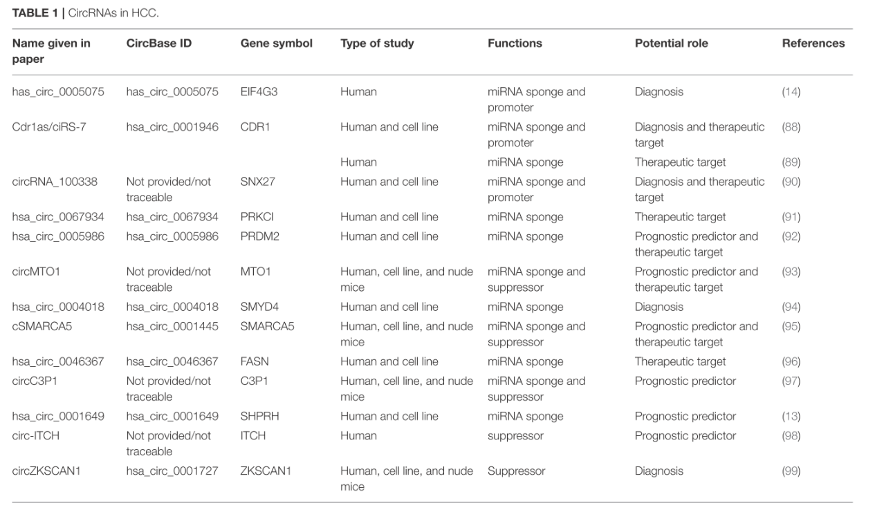 图注:目前报道的与HCC相关的主要circRNA信息汇总表。