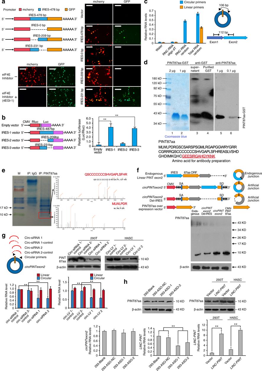 图注:证实Circ-PINT翻译全新多肽PINT87aa的系列实验