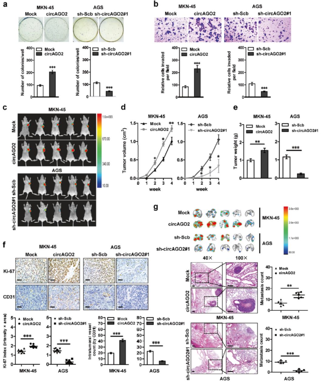 图注:体内外实验证实circAGO2可促进胃癌细胞增殖和迁移