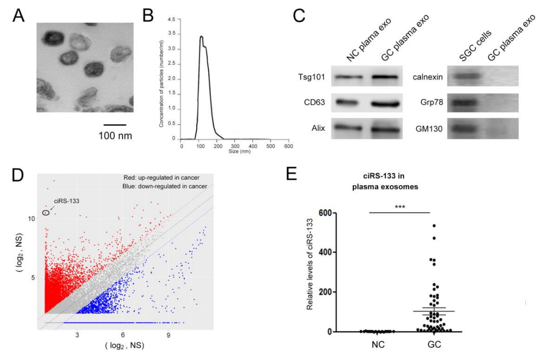 图注:A:电镜检测分离自人血浆外泌体;B:NTA纳米颗粒示踪仪分析外泌体粒径;C:Western blot分析外泌体表面标志物;D:circRNA芯片初步筛查胃癌血浆来源外泌体中的circRNAs;E:RT-qPCR验证ciRS-133在胃癌血浆中显著高表达。