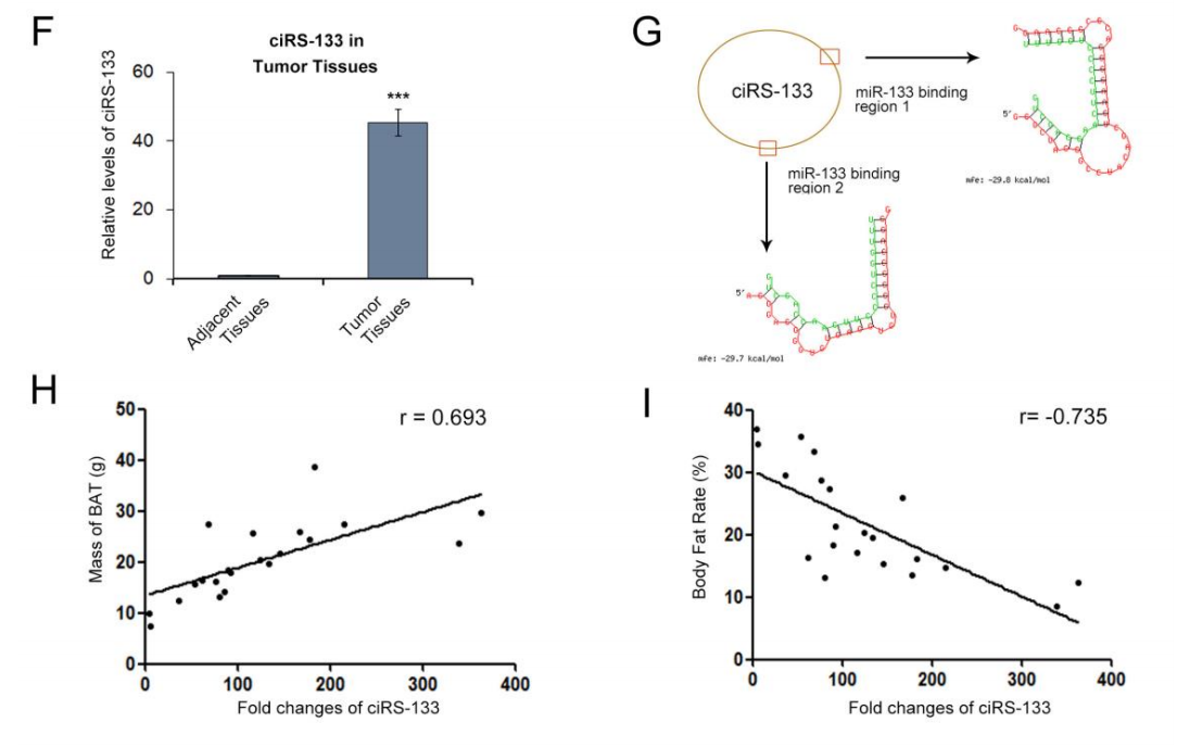 图注:F:相对于癌旁组织,ciRS-133在胃癌组织中显著高表达;G:生信预测发现ciRS-133上存在2个miR-133结合位点;H:ciRS-133与褐色脂肪组织(BAT)质量正相关;I:ciRS-133与个体脂肪比率负相关。
