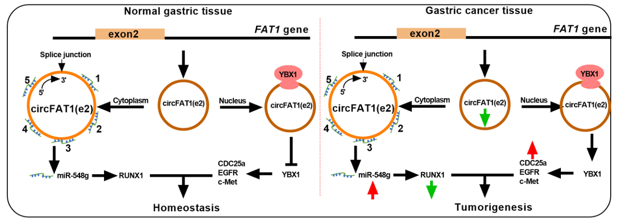 在本研究中,研究者通过分析挖掘GEO数据库中胃癌(GC)组织环状RNA (circRNA)表达谱。发现一个新的circRNA, has_circ_0001461,我们称之为circFAT1(e2)并进一步证实circFAT1(e2)在胃癌组织和细胞系中显著下调,并与胃癌患者的总体生存率相关。荧光原位杂交(FISH)分析显示circFAT1(e2)分布在GC细胞的细胞质中,也可分布在细胞核中。功能实验表明,circFAT1(e2)的过表达抑制了GC细胞的增殖、迁移和侵袭。然后,我们研究circFAT1(e2)是否作为microRNA-549g(miR-548g)的海绵并调控肿瘤抑制因子RUNX1在GC细胞中的表达。此外,我们发现位于核的circFAT1(e2)可以直接与Y-box结合蛋白-1 (YBX1)相互作用并抑制其功能。综上所述,circFAT1(e2)可能通过调节细胞质中的miR-548g/RUNX1轴,靶向细胞核中的YBX1,在GC细胞中发挥抑癌作用。