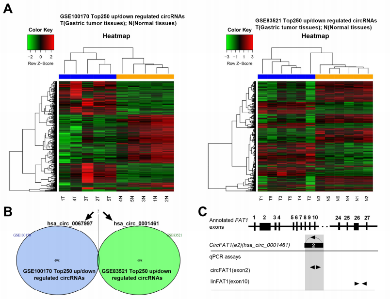 图注:A:通过生物信息学技术挖掘GEO中胃癌中差异表达的circRNA表达谱并绘制聚类热图;B:两个GEO数据集中存在两个重叠的circRNA(GSE100170和 GSE83521);C: circFAT1(e2)基因组定位示意图;