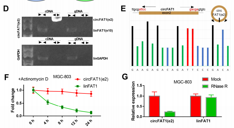 图注:D:RT-PCR在gDNA和cDNA中验证circFAT1(e2)的表达;E:sanger测序验证circFAT1(e2)的反向拼接位点序列;F:RT-PCR检测circFAT1(e2)和linFAT1在放线菌D处理MGC803细胞中的表达情况;G:RT-PCR检测circFAT1(e2)和linFAT1在RNase R处理MGC803细胞中的表达情况;