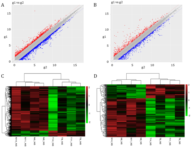 图注: circRNA芯片的散点图和聚类热图展示了circRNA和mRNA在前列腺癌组织和正常组织中的差异表达情况