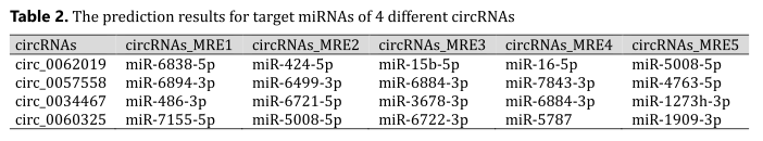 表2:生物信息学预测4个差异表达的circRNA可能结合的miRNAs