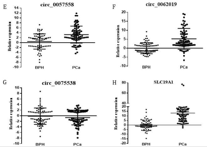 图注:三个circRNA分子(circ_0057558, circ_0062019, circ_0075538)和SLC19A1在前列腺癌和癌旁组织中的差异表达情况(采用qRT-PCR技术检测)