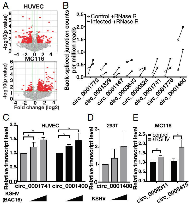 图注:KSHV感染过程中人特定circRNA被诱导差异表达。A:微阵列技术检测发现KSHV感染细胞中人circRNA差异表达情况(火山图)。B:KSHV感染人HUVECs细胞circRNA-seq测序发现多个高表达circRNA分子;C,D和E:RT-PCR检测KSHV感染人HUVEC,293t和MC116细胞特定circRNA表达水平变化。