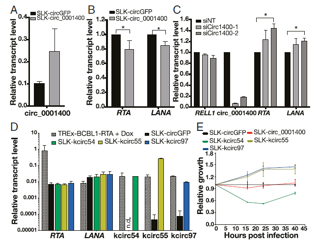 图注:circRNA调控病毒基因的表达和细胞生长。A:SLK细胞中过表达hsa_circ_0001400后数字PCR检测其表达水平;B:KSHV感染hsa_circ_0001400稳定过表达的SLK细胞后,RT-dPCR检测病毒基因表达水平;C:siRNA敲低circRNA后RTA,LANA等基因表达水平变化;D:多个circRNA在KSHV感染的BAC16细胞中可调控细胞增殖能力。