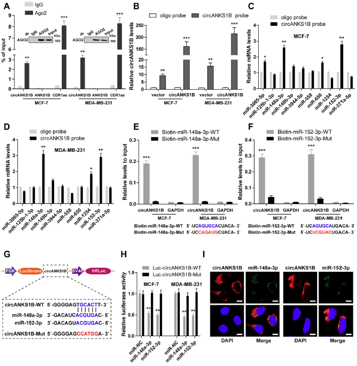 图注:乳腺癌中circANKS1B可吸附miR-148a-3p和miR-152-3p。A:RIP实验,利用抗AGO2抗体免疫共沉淀检测到circANKS1B,表明circANKS1B与AGO2存在相互作用;B:生物素标记circANKS1B特异性探针可特异性检测circANKS1B;C-D:circANKS1B生物素探针免疫共沉淀实验后,qPCR检测可能结合的miRNA表达水平;E-F:野生型和突变型生物素标记的miR-148a/152-3p模拟物转染circANKS1B过表达的MCF-7和MDA-MB-231细胞后,链霉亲和素捕获,qPCR检测circANKS1B表达;G-H:荧光素酶报告基因实验检测miR-148a/152-3p和circANKS1B直接互作;I:FISH免疫荧光杂交实验miR-148a/152-3p和circANKS1B共定位情况。