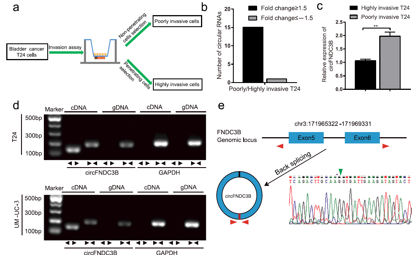 图注:A:膀胱癌T24细胞体外侵袭模型建立示意图;B:T24侵袭模型筛选到多个差异表达的circRNA(含circFNDC3B);D-E:RT-PCR检测到特异性circFNDC3B并通过了sanger测序验证;