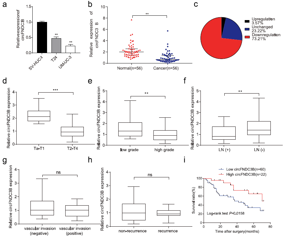 图注:56对膀胱癌组织标本中qPCR检测证实circFNDC3B在膀胱癌组织显著低表达,且与T分级,淋巴结转移和血管侵袭相关,膀胱癌中低低表达的circFNDC3B预后差。