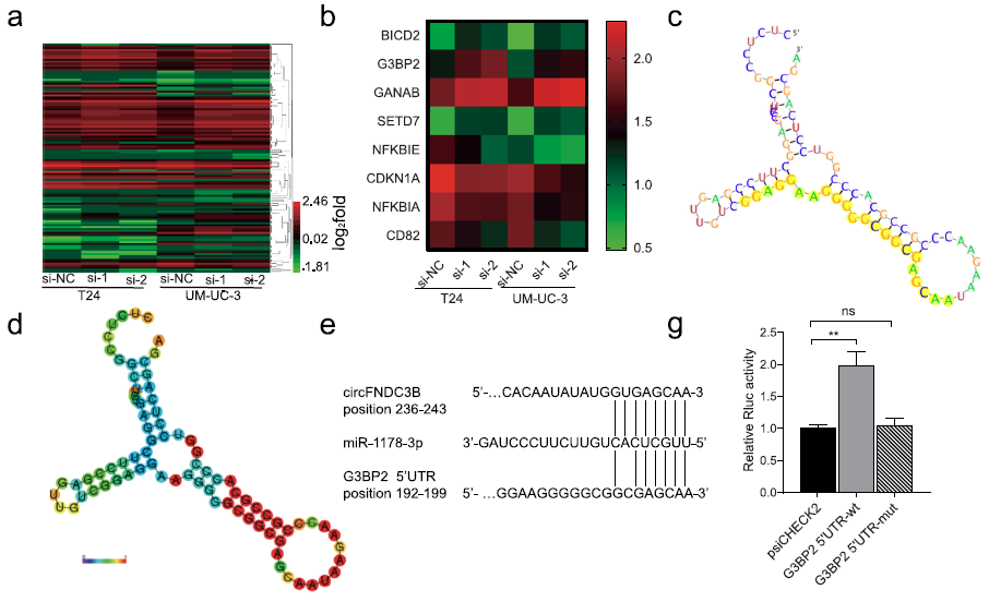 图注:a:膀胱癌细胞中敲低circFNDC3B后高通量检测差异基因表达情况;b:敲低circFNDC3B后G3BP2等肿瘤相关基因表达热图展示;c-d:G3BP2的5’UTR基因 与miR-1178-3p存在结合位点预测;e:G3BP2的5’UTR,miR-1178-3p,circFNDC3B结合位点碱基配对情况;g:荧光素酶报告基因检测到G3BP2的5’UTR与miR-1178-3p直接结合。