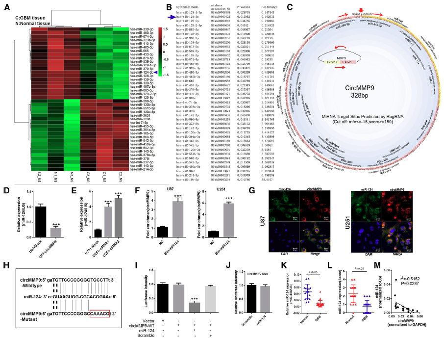 图注:circMMP9作为miR-124海绵的验证。A:GBM中差异表达前20的miRNA表达谱热图;B:差异表达前20的miRNA详细信息表;C:RegRNA预测circMMP9可结合miRNAs的示意图;D-E:过表达或缺失circMMP9的U87和U251细胞中检测miR-124表达水平;G:FISH实验鉴定circMMP9和miR-124在细胞中的共定位情况;H:circMMP9和miR-124结合位点野生型和突变型具体碱基配对关系;I-J:萤火虫荧光素酶报告基因验证circMMP9和miR-124结合关系;K:qRT-PCR检测GBM组织和正常脑组织中miR-124表达水平在GBM中显著低表达;L:IHC免疫组化实验测定miR-124在GBM组织中显著低表达;M:circMMP9和miR-124表达水平显著负相关(pearson相关系数)。