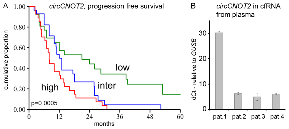 图注:A:circCNOT2表达与AI治疗患者Kaplan-Meier生存曲线临床评估;B:circCNOT2患者血浆样本中的表达