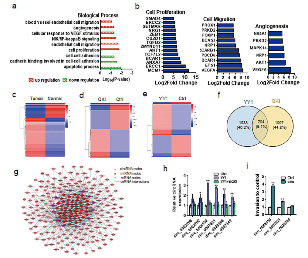 图注:QKI与EMT过程相关并促进circRNA形成。A:QKI过表达的PLC-PRF-5细胞表达谱芯片分析发现,主要与VEGF,NF-KB通路激活,细胞粘附和凋亡途径下调相关。B:过表达QKI后上调基因主要与细胞增殖、迁移和血管生成相关。c、d、e:肿瘤、QKI过表达和YY1过表达组中circRNA聚类分析发现大部分circRNA受QKI和YY1影响。F:受QKI和YY1过表达影响而上调的circRNA交集图。G:circRNA,miRNA和mRNA的ceRNA互作网络图。H:qPCR验证的部分受QKI和YY1影响的circRNA。I:QKI调控的circ0008150, circ0007821, 和 circ0029308可促进细胞侵袭能力增强。