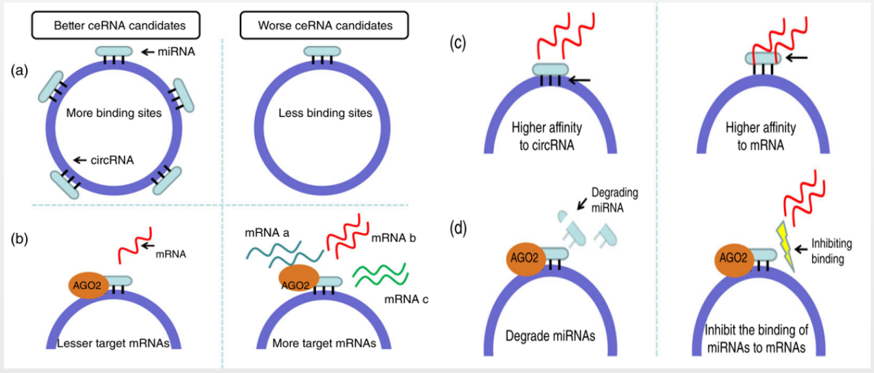 图注:ceRNA形成的先决条件示意图,a:circRNA含有miRNA多个结合位点好过少个结合位点;b:miRNA靶向较少种类mRNA;c:circRNA跟miRNA的亲和力要高于miRNA跟mRNA的亲和力;d:circRNA绑定miRNA后可引起miRNA降解或抑制miRNA-mRNA结合。