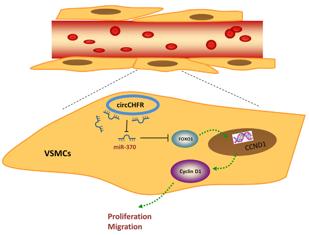图注:circCHFR通过circCHFR/miR-370/FOXO1/Cyclin D1轴促进平滑肌细胞增殖和迁移