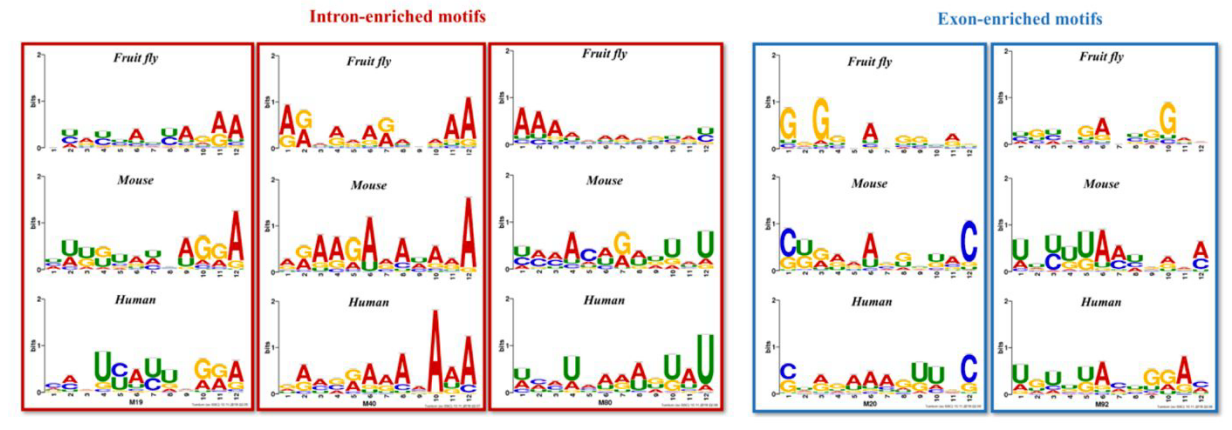 图注:DeepCirCod分析人、小鼠和果蝇中部分circRNA反向剪切位点附近保守的motif基序
